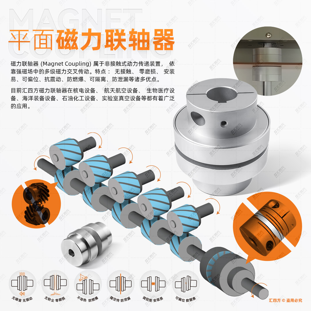 相比其他類型的聯(lián)軸器,磁力耦合器具有一些獨特的優(yōu)點。例如,它可以實現(xiàn)大扭矩低轉(zhuǎn)速(約3000轉(zhuǎn)以下)和小扭矩高轉(zhuǎn)速(約36000轉(zhuǎn)以下)。此外,磁力耦合器的安裝和維護在長期使用中是非常劃算的。它可以實現(xiàn)非接觸式傳動,具有結(jié)構(gòu)簡單、維護方便、調(diào)速范圍廣等優(yōu)點。